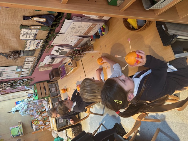 Katrina came in to teach us all about what a Christingle was and we each made one with the help of some of our Governors. We learnt about what each item represented and labelled the Christingle in our floor book.