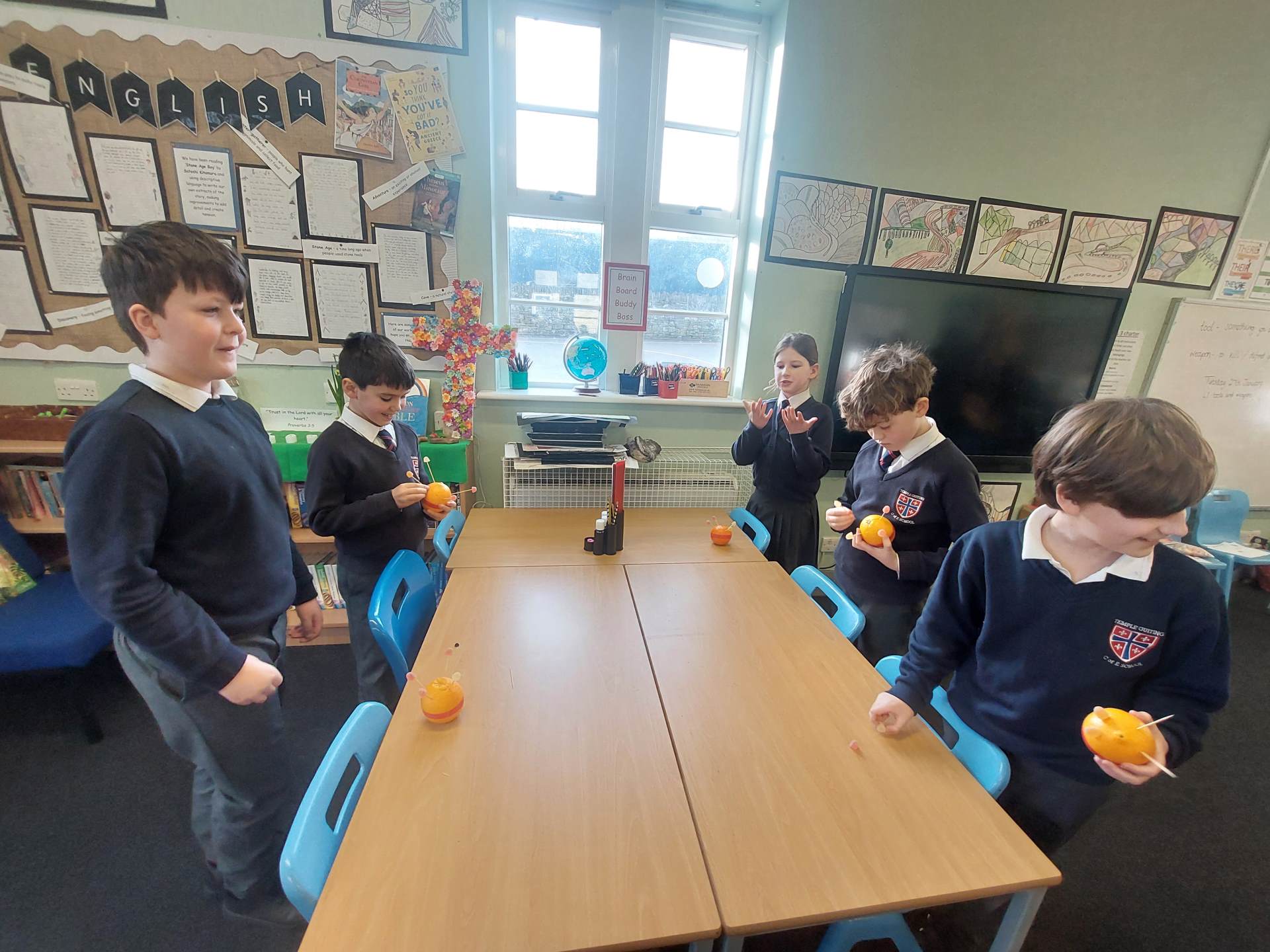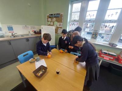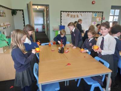 Moira and Judy, from Open the Book, came in to visit us. We talked all about Christingle and the meaning behind the different elements. Then we all made a Christingle ready to take to church with us on Thursday.