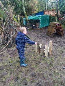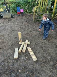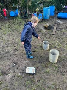 It has been a little bit wet recently but this did not dampen our spirits. The children all got wrapped up and embraced the mud! Reception have been looking at 'toys' as their topic this term. We chatted around base camp about how children played outside many years ago, with no plastic toys in sight. We made some conker targets, a conker run, our own take on skittles and stepping stones. It was great fun!