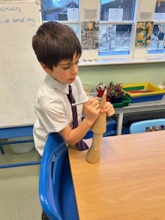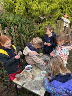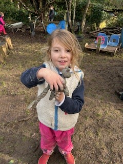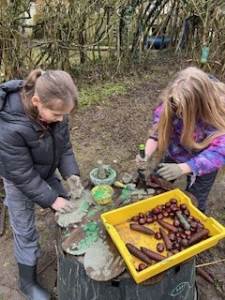 It has been a little bit wet recently but this did not dampen our spirits. The children all got wrapped up and embraced the mud! Reception have been looking at 'toys' as their topic this term. We chatted around base camp about how children played outside many years ago, with no plastic toys in sight. We made some conker targets, a conker run, our own take on skittles and stepping stones. It was great fun!